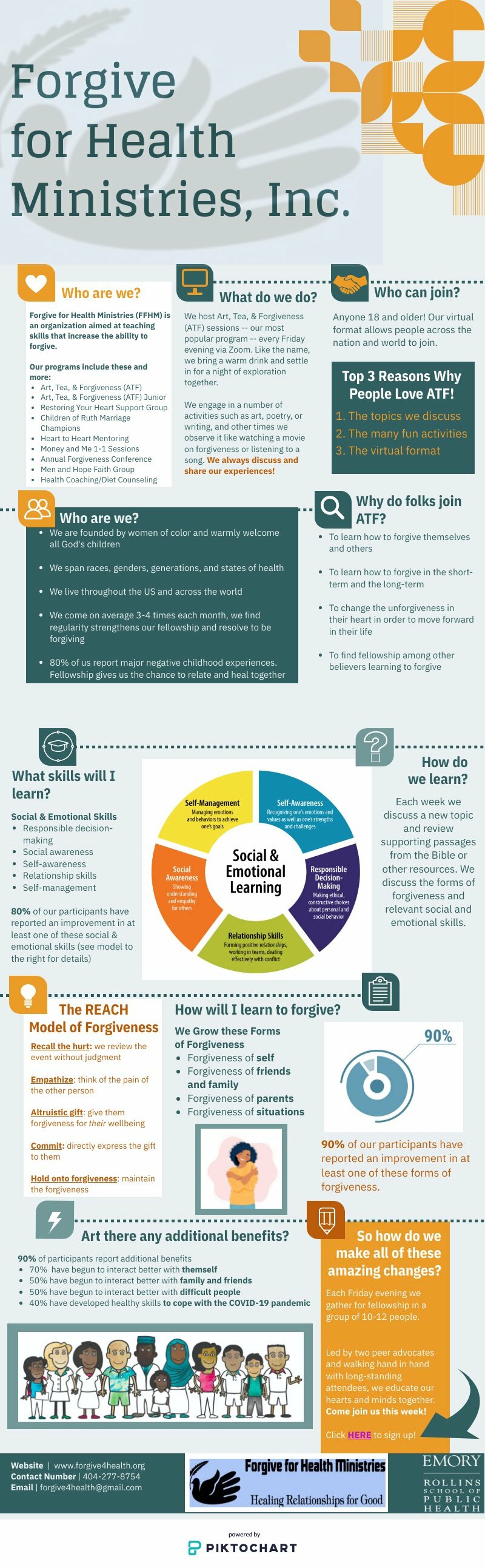 Ever wondered if you have forgiven someone who hurt you? Want to forgive, but not sure how? Then complete a forgiveness assessment and start the journey to total healing. Call our ministries to receive a free forgiveness assessment, then use your scores to start the process of forgiveness. Clients are also welcome to participate in our monthly forgiveness seminars offered in churches, libraries, work sites, and other sites across our community. See FFHM Infographic and call us at 404-294-4072 to receive a forgiveness assessment and listing of upcoming forgiveness seminars in your area.